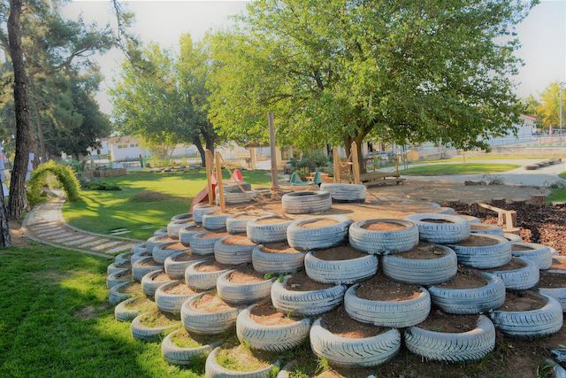 Σε μία έκταση 2000 τ.μ. κατασκευάστηκε ένας κήπος ο οποίος ικανοποιεί τις ανάγκες των παιδιών για ελεύθερη έκφραση, δημιουργικό παιχνίδι και παιδαγωγικές δραστηριότητες συντελώντας στην ψυχική και σωματική τους ανάπτυξη.
