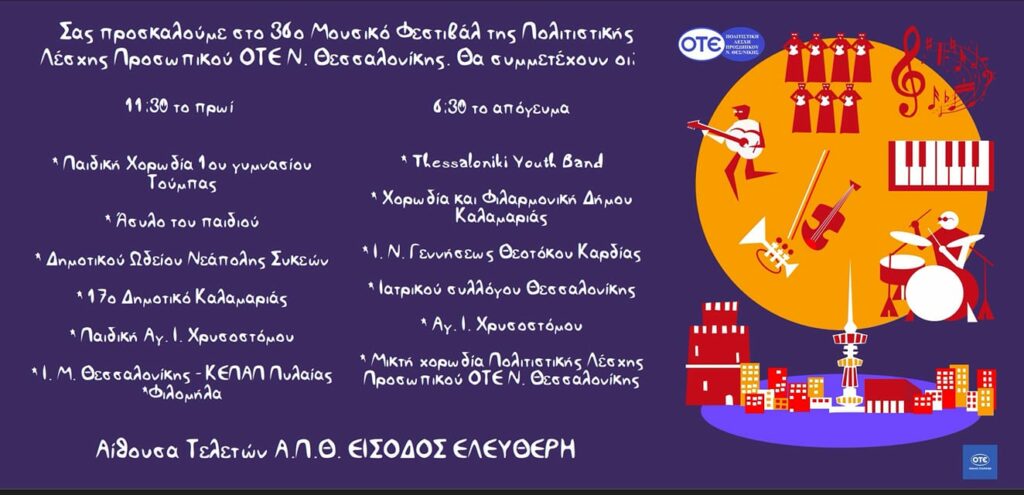 Θερμά συγχαρητήρια στη χορωδία μας για την εξαιρετική της εμφάνιση στο 36ο Μουσικό Φεστιβάλ της Πολιτιστικής Λέσχης Προσωπικού ΟΤΕ Ν. Θεσσαλονίκης που πραγματοποιήθηκε την Κυριακή 19 Μαρτίου 2023 στην Αίθουσα Τελετών Α.Π.Θ.
