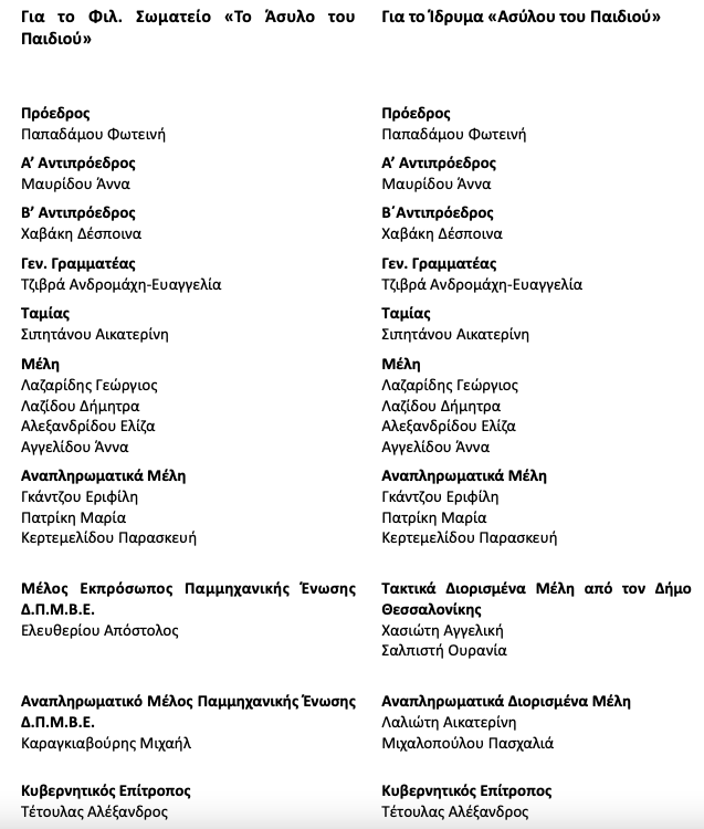 Μετά τις αρχαιρεσίες της Τακτικής Γενικής Συνέλευσης των Μελών του Φιλανθρωπικού Σωματείου «Το Άσυλο του Παιδιού», της 17ης Μαρτίου 2025 και τον διορισμό μελών από τον Δήμο Θεσσαλονίκη-Διεύθυνση Προσχολικής Αγωγής και Οικογενειακής Μέριμνας Τμήμα Συντονισμού, Εποπτείας & Διοικητικής Υποστήριξης και την Παμμηχανική Ένωση Διπλωματούχων Μηχανικών Βορείου Ελλάδος, το νέο Δ.Σ. του «Ασύλου του Παιδιού» είναι το εξής: