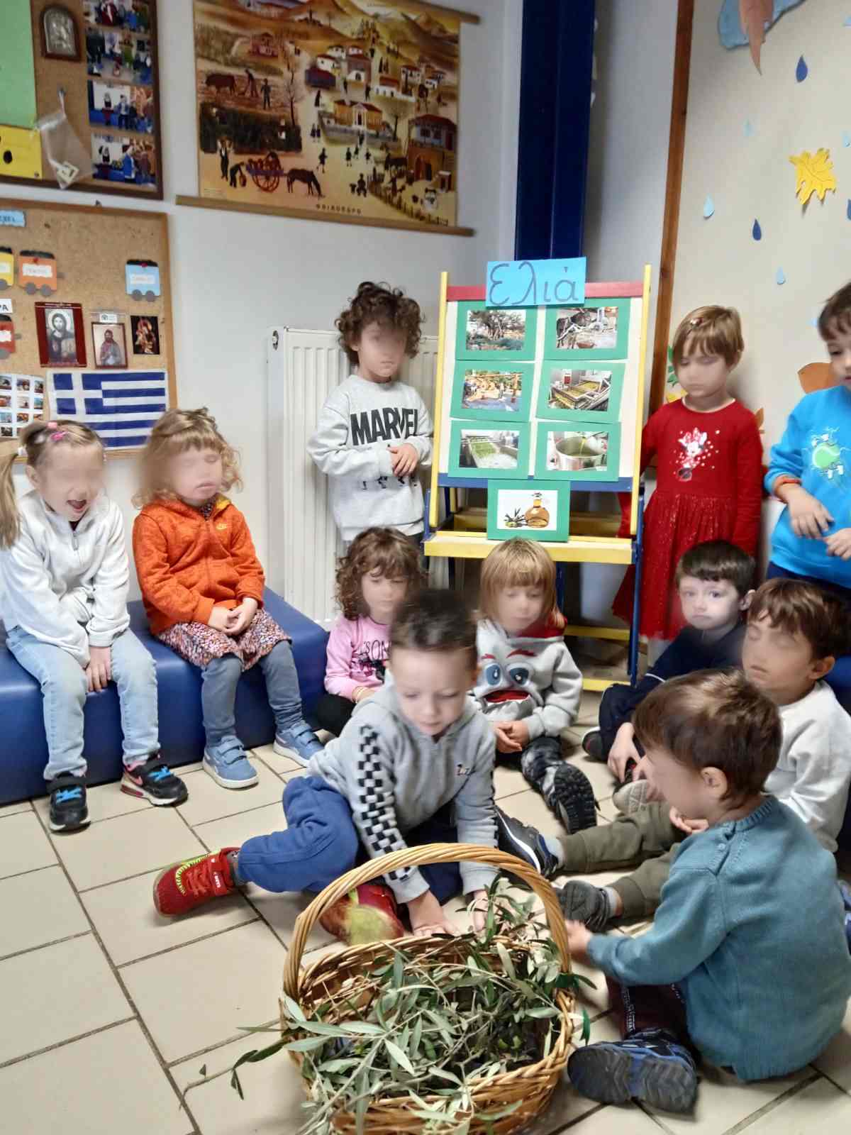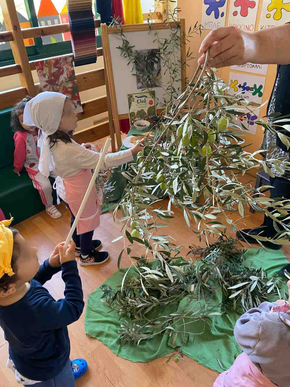 Επιπλέον, τα μικρά παιδάκια του Α’ Συγκροτήματος, είχαν την ευκαιρία με ένα κλαδί ελιάς να βιώσουν μέσα από τη δραματοποίηση το λιομάζεμα, να μάθουν για την ιστορία της ελιάς, τη διαδικασία καλλιέργειας και την διατροφική της αξία, να φτιάξουν ελαιόψωμα, να ζωγραφίσουν και να δημιουργήσουν κατασκευές.
