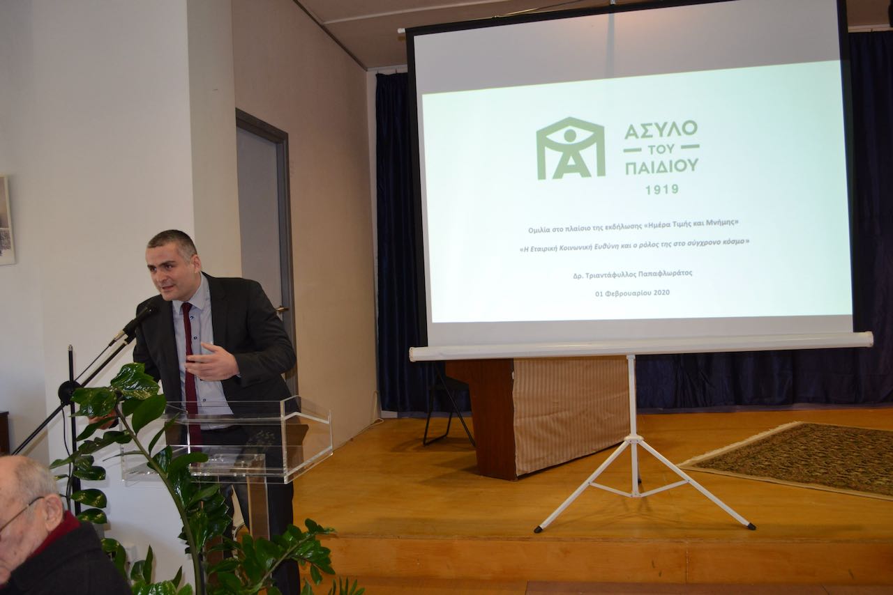Ο κεντρικός ομιλητής της εκδήλωσης, κ. Τριαντάφυλλος Παπαφλωράτος, Δρ. Εταιρικής Κοινωνικής Ευθύνης , εξήγησε τον όρο Εταιρική Κοινωνική Ευθύνη και τόνισε τη σημασία της ενσωμάτωσής της στις επιχειρήσεις.