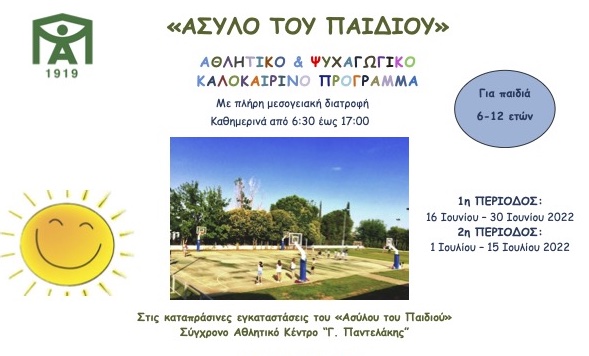 - Το καλοκαιρινό πρόγραμμα πραγματοποιείται στις πευκόφυτες εγκαταστάσεις του Β’ Συγκροτήματος του «Ασύλου του Παιδιού».