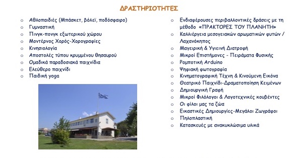 Μετά το μεσημεριανό γεύμα συνεχίζουμε με δραστηριότητες όπως κινηματογραφική τέχνη και κινούμενη εικόνα, ηλεκτρονικούς υπολογιστές, απλά πειράματα φυσικής, φωτογραφία και δημιουργική απασχόληση για όλες τις ηλικίες. Μικρή διακοπή για απογευματινό και μοίρασμα των εντυπώσεων για το πρόγραμμα της ημέρας.