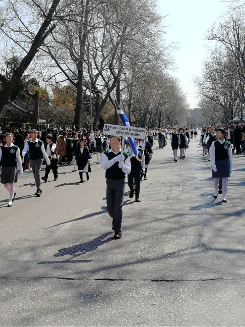 Την Παρασκευή 25 Μαρτίου 2022, οι μαθητές των Ε’ και Στ’ τάξεων του 33ου Δημοτικού Σχολείου του «Ασύλου του Παιδιού» τίμησαν την εθνική επέτειο, παρελαύνοντας με υπερηφάνεια στη Λεωφόρο Μεγάλου Αλεξάνδρου υπό τους ήχους της μπάντας του Δήμου Θεσσαλονίκης. Τα παιδιά μας εκπροσώπησαν επάξια την πρωτοβάθμια εκπαίδευση και απέσπασαν τον θαυμασμό και το θερμό χειροκρότημα των παρευρισκομένων. Με την ελπίδα ότι θα αποτελέσουν θεματοφύλακες της ειρήνης στο μέλλον και θα υποστηρίζουν το ιδεώδες της ελευθερίας των λαών, τους αξίζουν πολλά συγχαρητήρια.