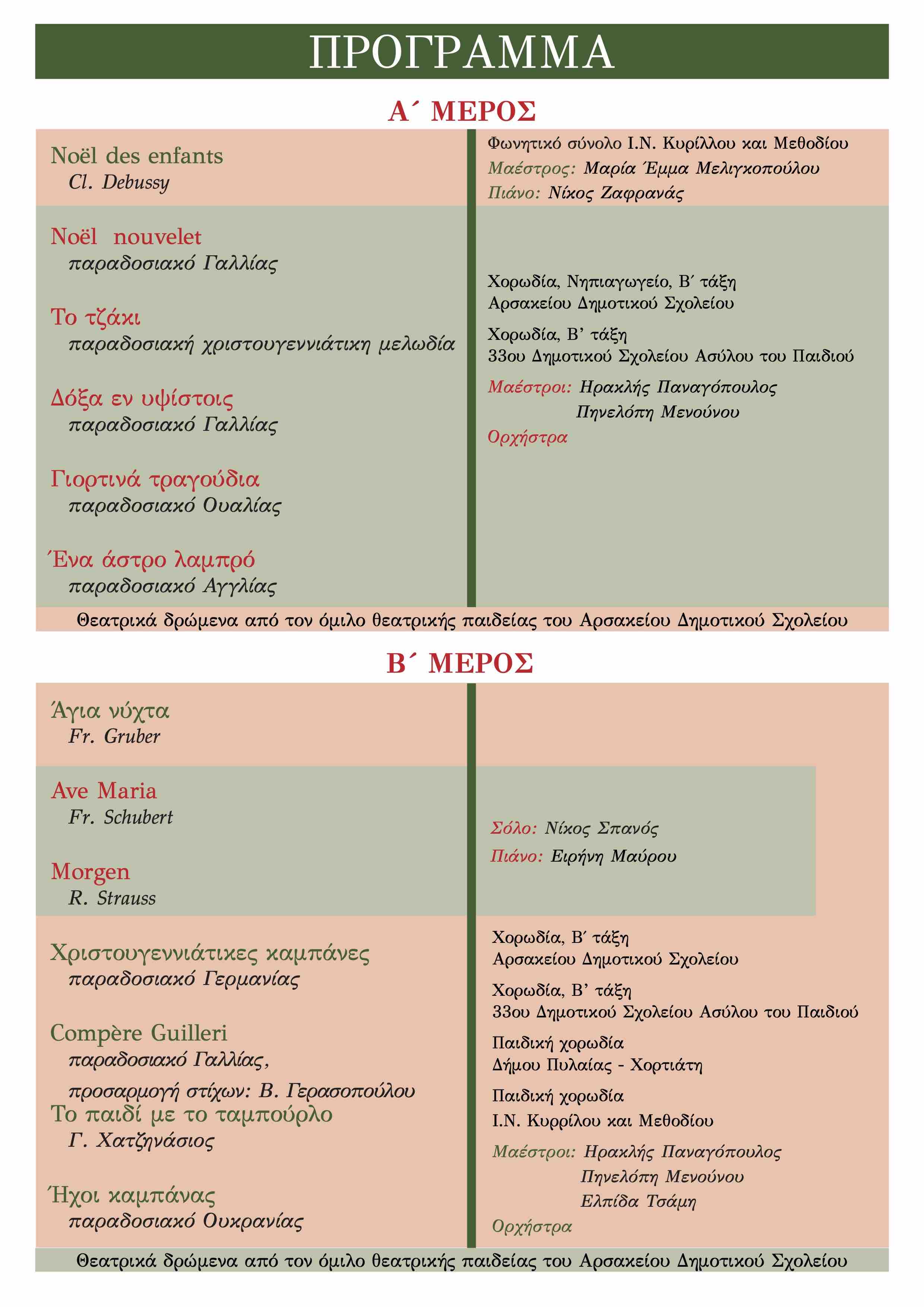 Τη Δευτέρα 9 Δεκεμβρίου 2019 στις 19:00 στην Αίθουσα Τελετών του Α.Π.Θ., οι μαθητές της Β’ τάξης, ο όμιλος Θεάτρου και η χορωδία του Αρσακείου Δημοτικού Σχολείου πραγματοποιούν Χριστουγεννιάτικη Φιλανθρωπική Εκδήλωση σε συνεργασία με τους μαθητές της Β’ τάξης και της χορωδίας του «Ασύλου του Παιδιού» και τις Παιδικές Χορωδίες του Δήμου Πυλαίας-Χορτιάτη και του Ιερού Ναού Κυρίλλου και Μεθοδίου.